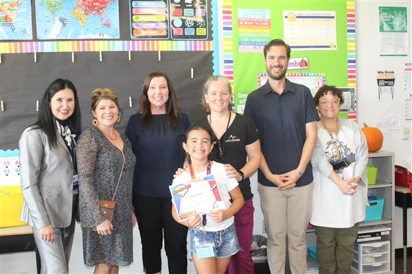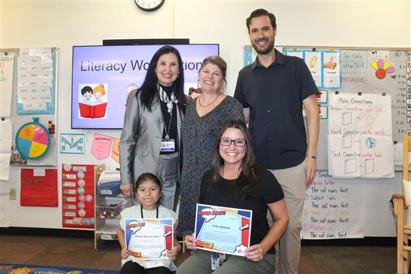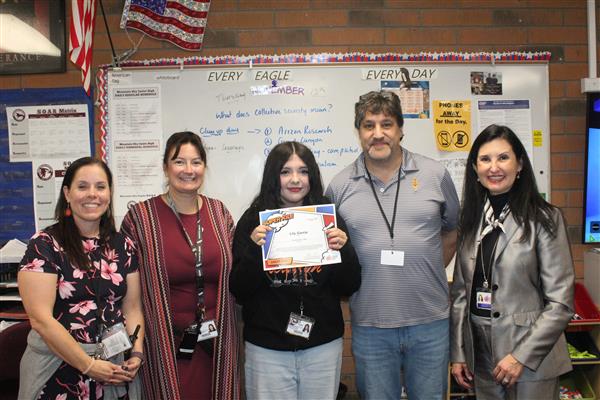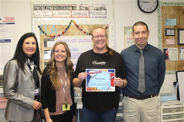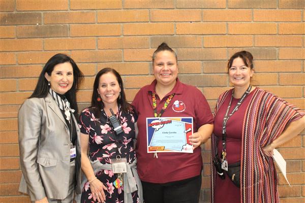 Melissa Medley, fifth grade teacher and Frank Schilling, facilities manager at John Jacobs; Erika DeBruhl, first grade teacher and Alejandro Mariscal (not pictured), music teacher at Lookout Mountain; Marisa Amaya, long term substitute and Cruz (Elva) Loa, nutrition services helper at Moon Mountain; and Cindy Carrillo, nutrition services manager and Rachel Zupancic, math teacher at Mountain Sky!Each of these standout staff members received a certificate and a Starbucks gift card thanks to the generosity of Veregy!
